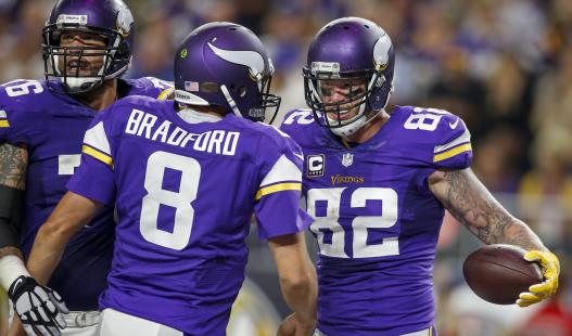 En el segundo cuarto, Sam Bradford tiró un pase de touchdown de siete yardas a su ala cerrada Kyle Rudolph, quien lleva tres partidos anotando. Aunque fue el único pase de anotación del mariscal, acabó el encuentro con 262 yardas y mantuvo su racha sin entregas de balón.
