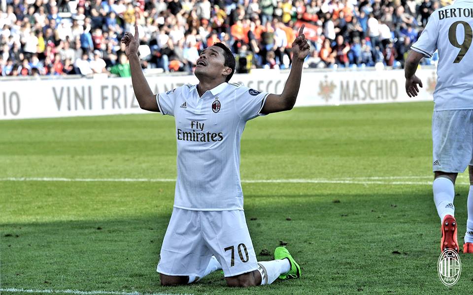 El máximo romperedes del Milán en esta temporada, Carlos Bacca llegó a nueve tantos con el gol que consiguió en este encuentro. Fue por la pena máxima y pese que se resbaló, logró vencer al arquero Consilgi. La jugada que provocó el penal, fue una individualidad del mediocampista Bertolacci cerca del área chica, que con ayuda de un recurso trato de quitarse la marca de tres rivales pero uno de ellos le puso el pie y lo derribó. Por lo que el juez Calvarese, no dudo en señalar su mano hacia el manchón penal.