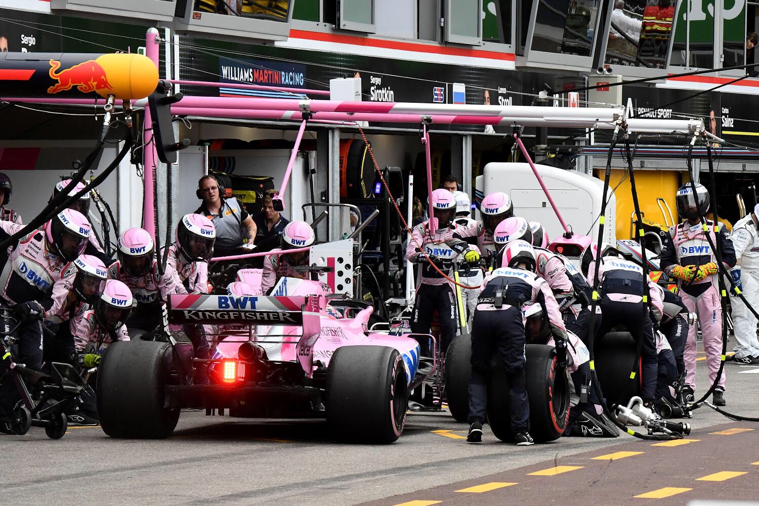 Durante la primera parada de boxes para Checo, su monoplaza sufrió problemas con una de las llantas traseras, por lo que se desperdició tiempo valioso y a la hora que el piloto mexicano regresó a la carrera ya había perdido segundos y posiciones.
