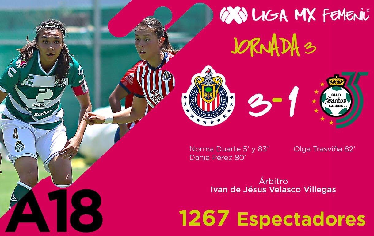 El equipo de Chivas femenil consiguió su tercera victoria consecutiva en la Liga MX femenil. El Rebaño venció al equipo de Santos 3-1 en el Estadio Verde Valle de Jalisco.