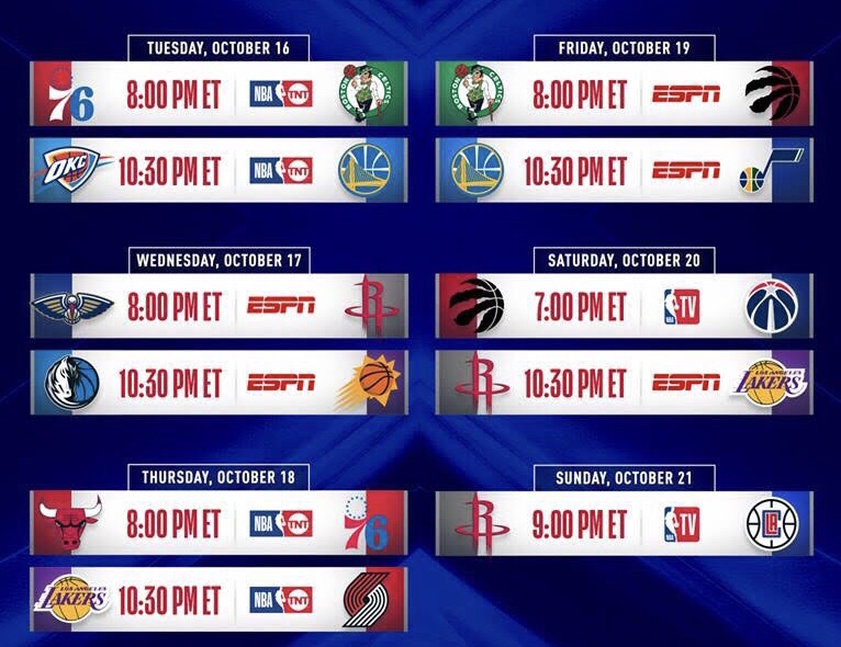 La temporada 73 de la NBA iniciará el martes 16 de octubre con dos juegos. El primero partido será el de los Sixers de Philadelphia que visitarán a los Celtics de Boston. Para cerrar la jornada inaugural, la defensa del campeonato de los Golden State Warriors iniciará ante el Thunder de Oklahoma City. Después de este juego, los Warriors recibirán los anillos como campeones de la temporada 2017-18