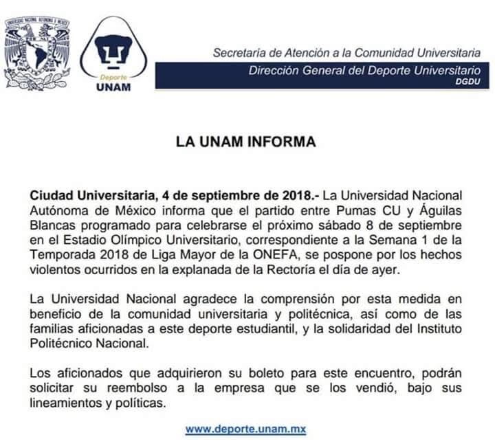 Tras los eventos sucitados el día lunes 3 de septiembre en las instalaciones de la Universidad Nacional Autonoma de México (UNAM), la Dirección General del Deporte Universitario decidió posponer el juego entre los Pumas CU y las Águilas Blancas del Instituto Politécnico Nacional.