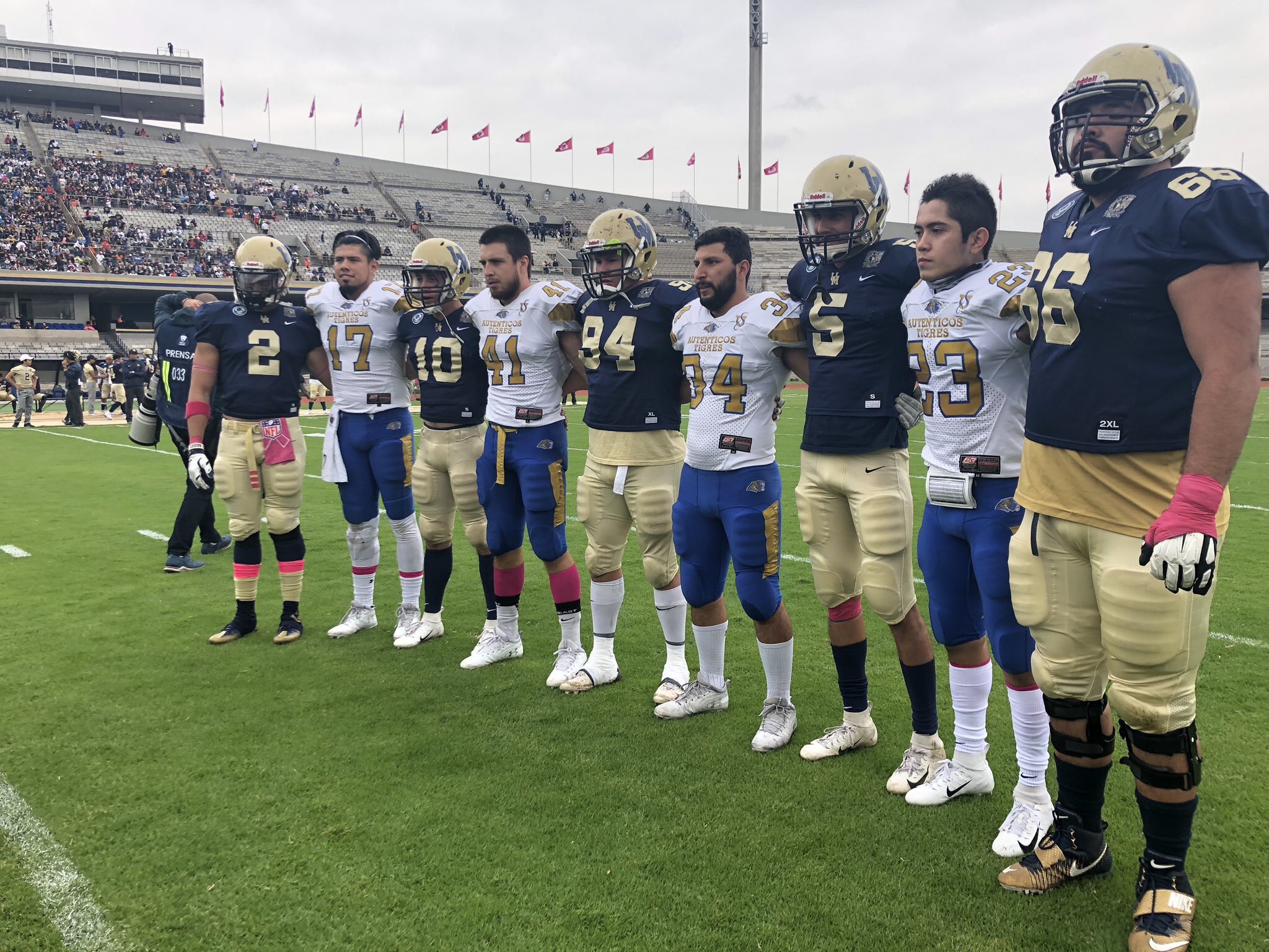 Faltaba un minuto para que finalizara la primera mitad, un excelente pase del Quarterback universitario puso a los Pumas en la yarda 15 de los Auténticos, una gran corrida coloco a los Capitalinos en la yarda uno, pero los Tigres pararon a la ofensiva, tercera y gol una yarda por avanzar, los locales decidieron ir con una jugada individual del Quarterback, que al final terminó en touchdown para los felinos. Diego Reyes entró para poner el 10 – 0 y con eso irse al descanso.