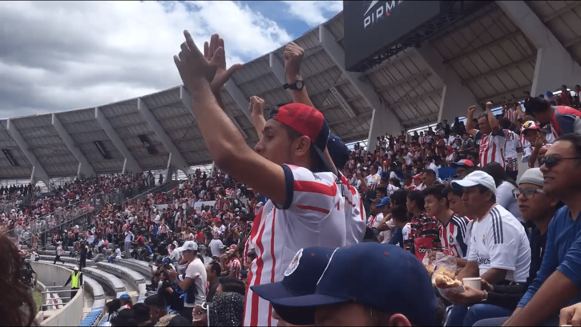 Durante los 90 minutos del encuentro, la porra visitante nunca dejó de apoyar al club, mientras cada que los pocos aficionados de Lobos querían motivar al club, resonaba el clásico “Chivas, Chivas”.