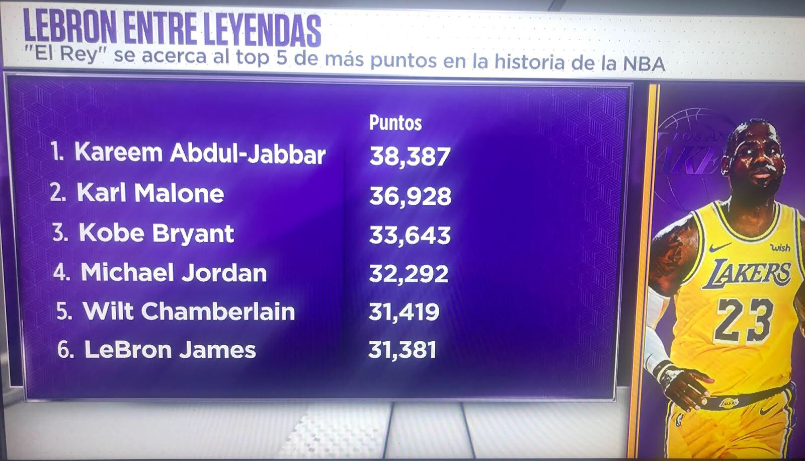 LeBron James llegó a este encuentro con 31,381 puntos en su carrera, y necesitaba 39 puntos para rebasar a Wilt Chamberlain y colocarse en la quinta posición de la tabla más legendaria de la NBA. James finalizó con 44 puntos, 10 rebotes y nueve asistencias en esta que fue una noche histórica para él y su legado.