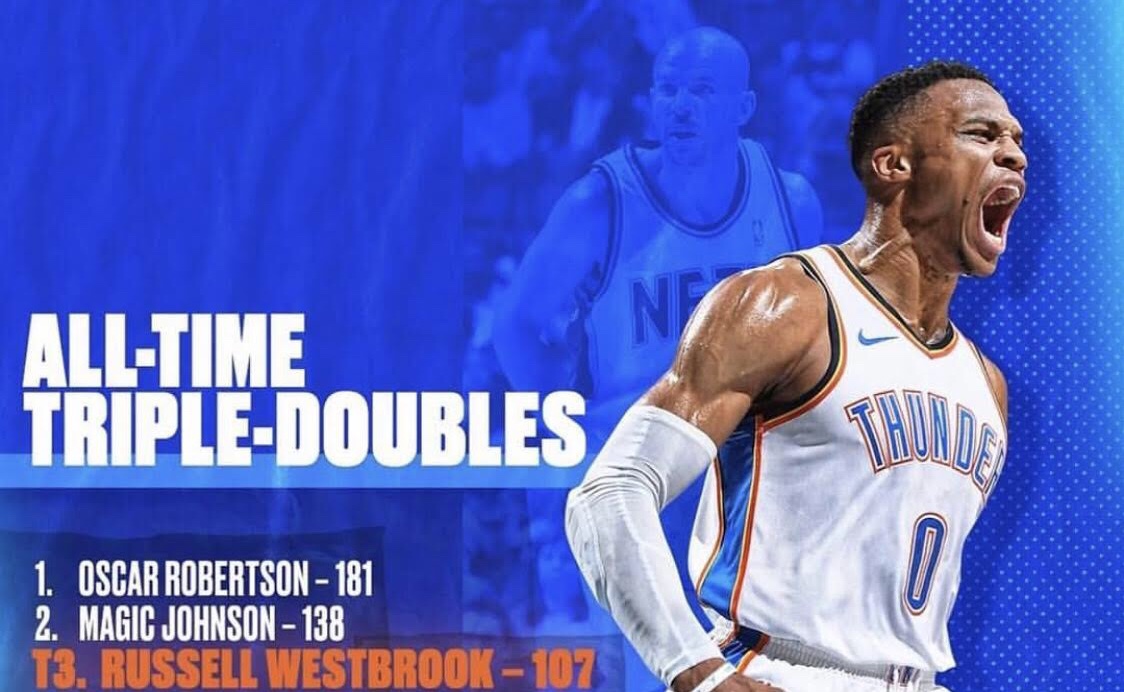 Russell Westbrook tuvo una noche histórica con 23 puntos, 19 rebotes y 15 asistencias para lograr su triple decena #107 y empatar a Jason Kidd convirtiéndose en el tercer jugador con más “triple-doble”, siendo solo Magic Johnson y Oscar Roberson los únicos con más. Paul George hizo lo propio con 18 unidades y cuatro rebotes.
