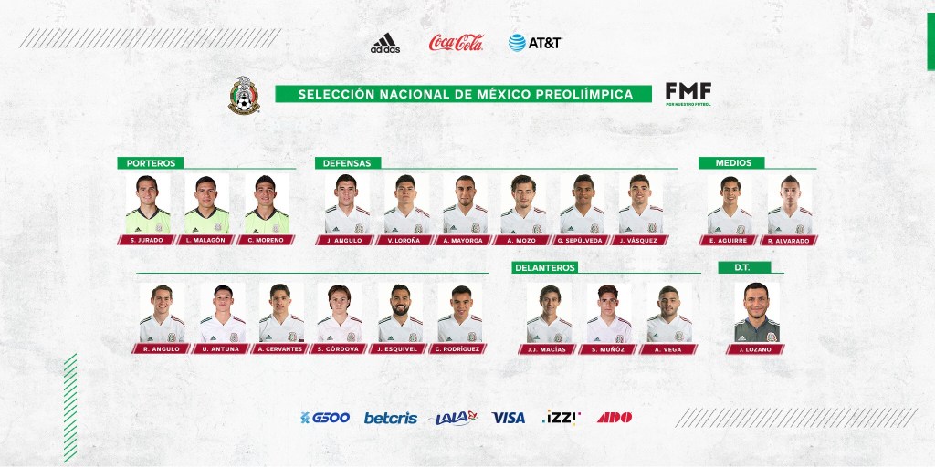 MEDIOCAMPISTAS: Érick Aguirre (Pachuca), Roberto Alvarado (Cruz Azul), Jesús Angulo (Chivas), Uriel Antuna (Chivas), Alan Cervantes (Santos), Sebastián Cordova (América), Joaquín Esquivel (FC Juárez) y Carlos Rodríguez (Monterrey).