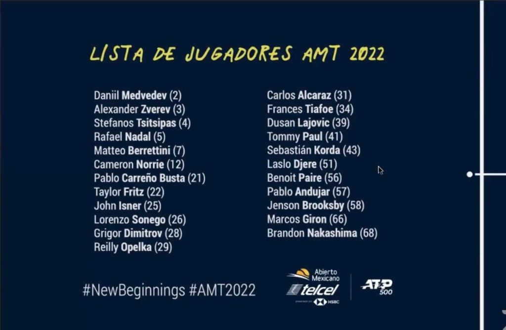 Raúl Zurutuza, director del Abierto Mexicano de Tenis, presentó de manera oficial a los primeros 23 tenistas, donde destaca la presencia de cinco de los mejores tenistas del mundo como Daniil Medvedev, el actual campeón Alexander Zverev, el griego Stefanos Tsitsipas, el tres veces campeón Rafael Nadal y el italiano Matteo Berrettini, además de Cameron Norrie, Taylor Fritz, Grigor Dimitrov, entre otros.