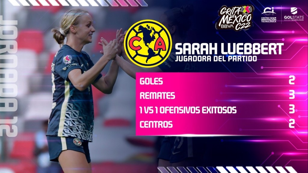 Para el minuto 12, apareció Sarah Luebbert con centro de la cancha izquierda y concretar el 2-0, con gol de cabeza y de está forma concluir el primer tiempo a favor de las Azulcremas.