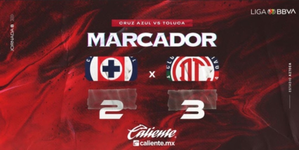 Toluca le ganó a Cruz azul con un marcador de 2-3 iban perdido 1-0 al minuto 19 ,con un gol de Ramiro José Funes y Jean Meneses lo empató al minuto 30.