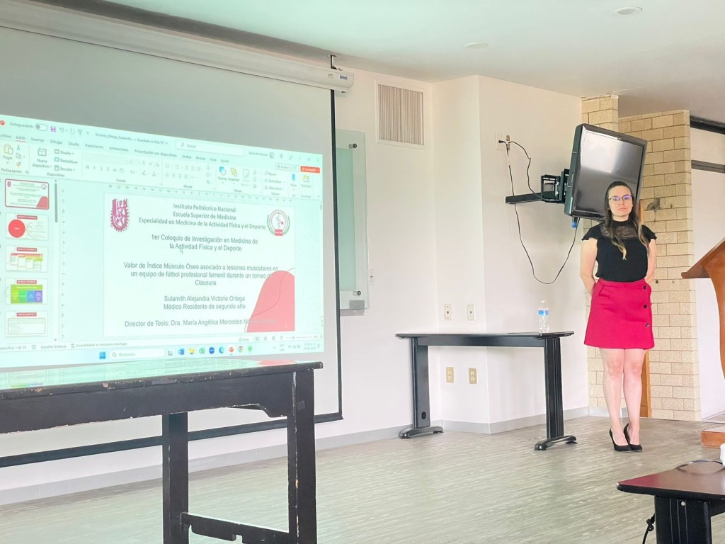 La Médico Residente de Segundo año en la Escuela Superior de Medicina del Instituto Politécnico Nacional, Sulamith Victorio Ortega, dio a conocer su proyecto de investigación ante las lesiones musculares del Fútbol Femenil en el primer coloquio de investgacion en medicina de la actividad física en el deporte en el Casco de Santo Tómas.