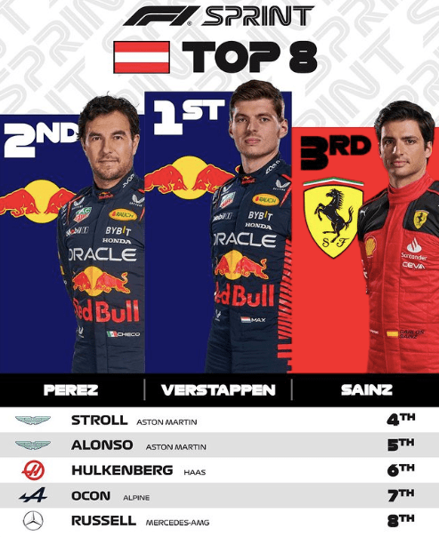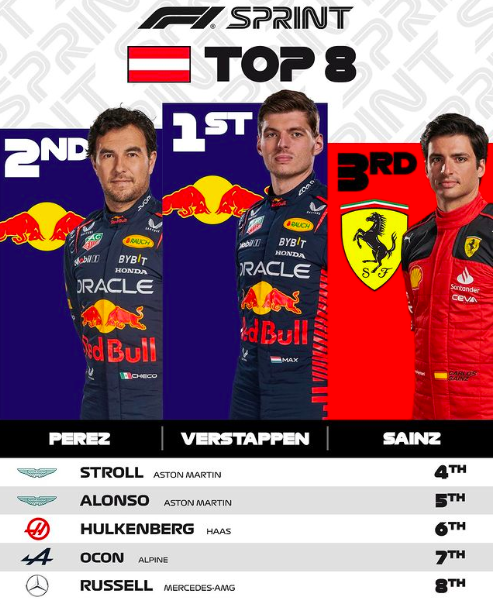El equipo Ferrari dio la sorpresa con su piloto Carlos Sainz, quien logró terminar en la tercera posición después de Checo Pérez y Max Verstappen el ganador de la Sprint.