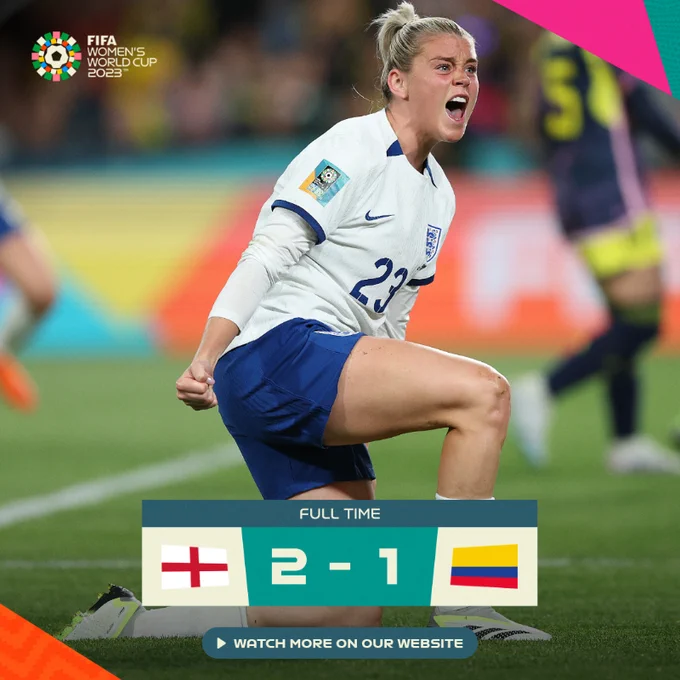 Sin embargo, por unos instantes el sueño de Inglaterra de pasar a semifinales se vio apagado, dado que Colombia inició con la ventaja en el marcador. Si bien, su ilusión y perseverancia se veían reflejadas en el campo, no bastó para vencer la experiencia de las inglesas.