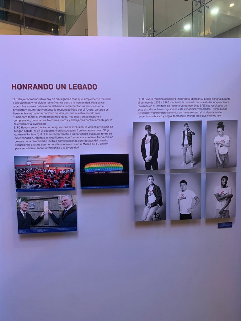 Después del resumen de la historia del Bayern, se habló sobre los valores y principios que representa el equipo, y como desde sus inicios promovían la inclusión, pues dos de sus fundadores eran judíos, Kurt Landauer y Beno Elkan, y en su plantel contaban con múltiples jugadores de religión judía, quienes fueron capturados y trasladados a campos de concentración, sin importar que eran ídolos del equipo.