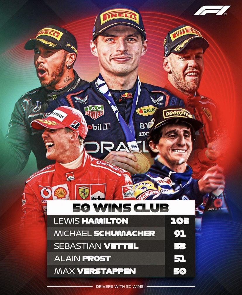 En esta gran carrera, Max Verstappen finalizó llevándose la bandera de cuadros, y así, se hizo acreedor de 50 victorias las cuales lo posicionan entre los cinco pilotos con más triunfos en Fórmula 1.