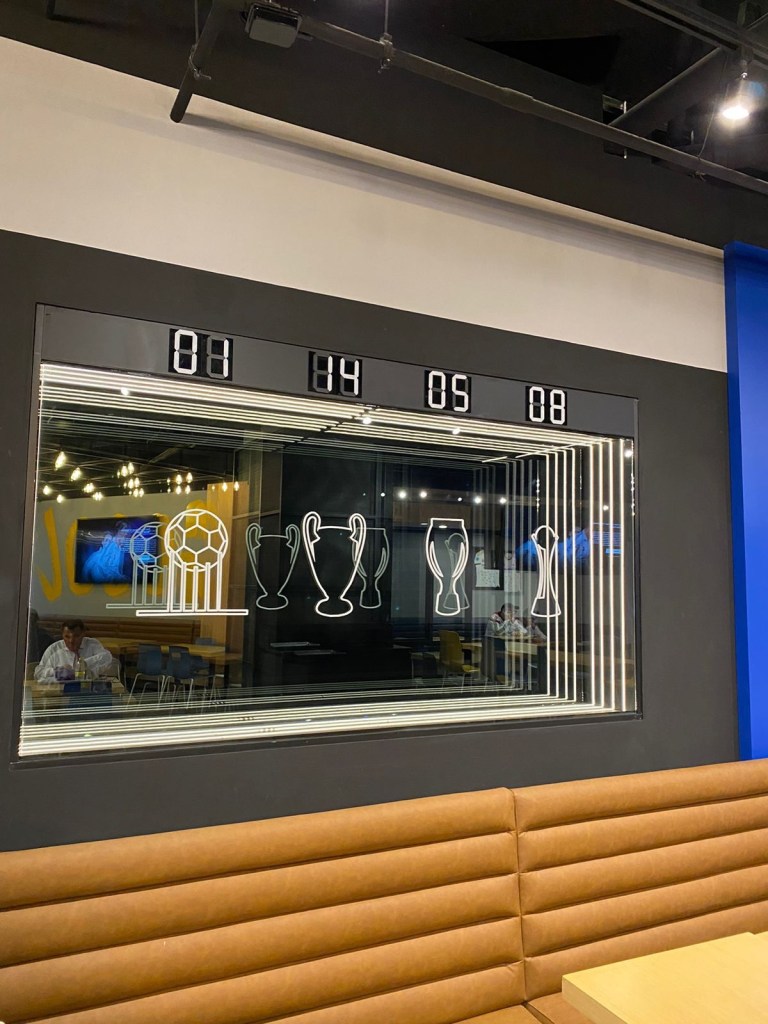 El espacio establecido para degustar los alimentos, es un lugar ideal para los fanáticos, ofrece un ambiente temático dedicado exclusivamente al Real Madrid.