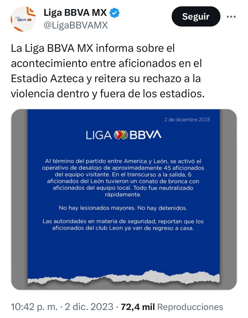La Liga MX lanzó un comunicado a redes sociales en el que informaron que el conflicto pudo detenerse a tiempo y el saldo de lesionados fue nulo.