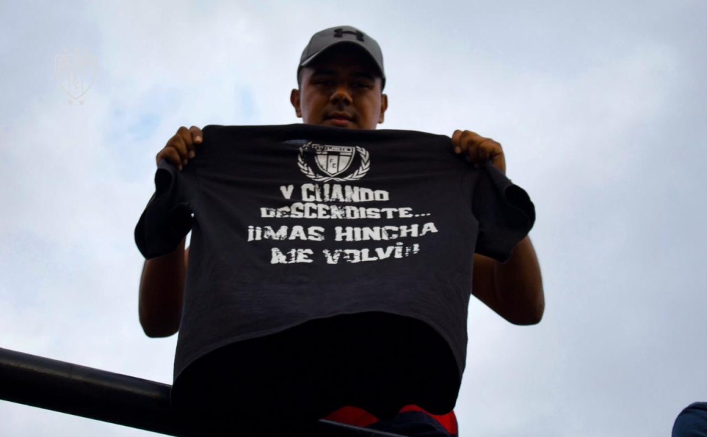 Miles de seguidores que apoyaron al “equipo del pueblo” estuvieron presentes en el estadio, como este aficionado con una camisa negra y con la leyenda “y cuando descendiste…¡Más hincha me volví!”.