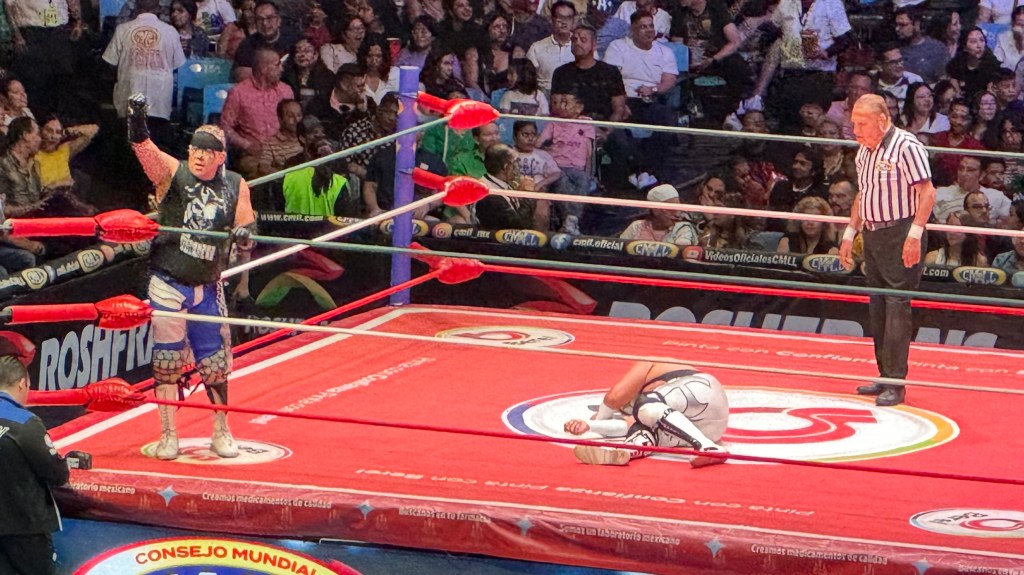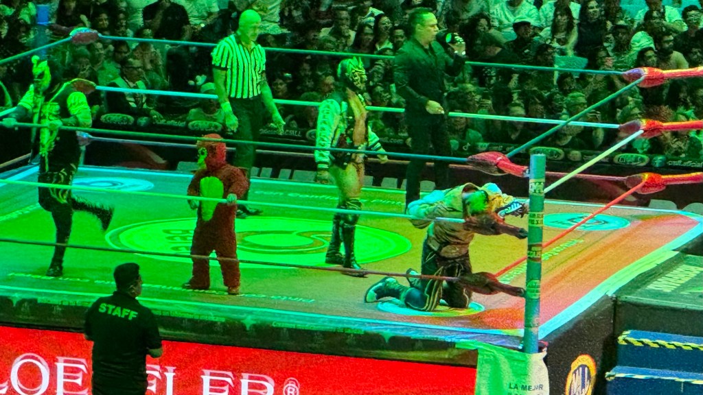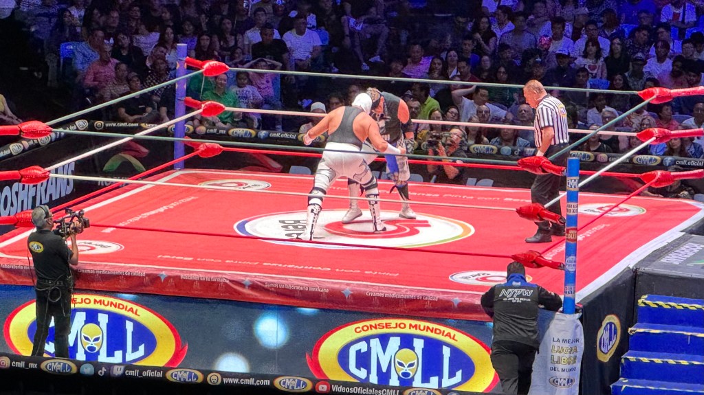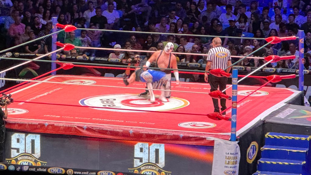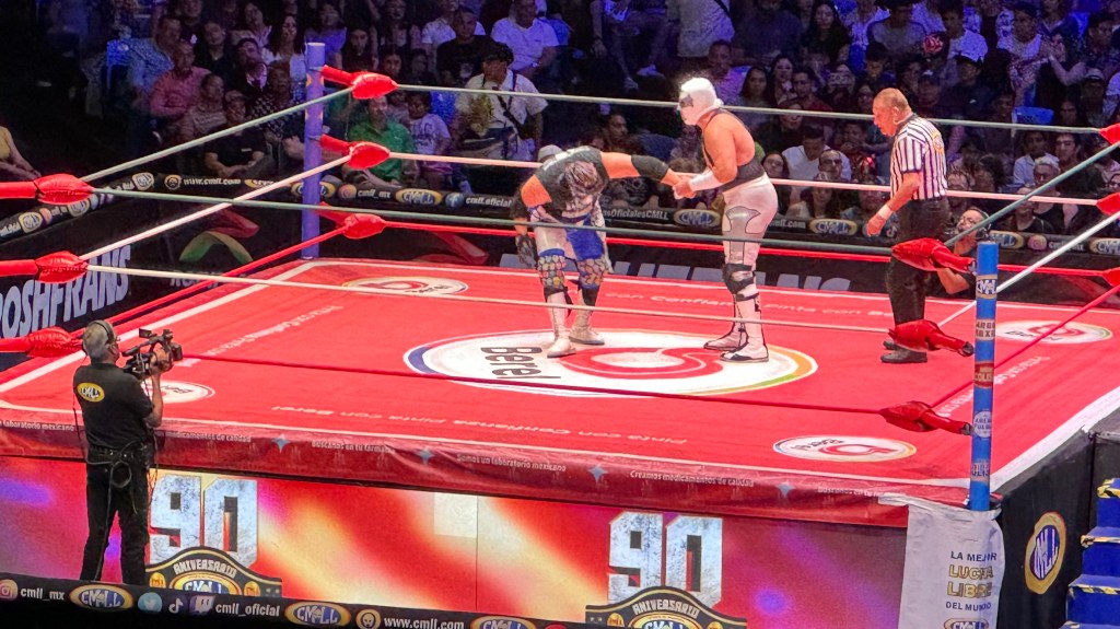 En el ring, la batalla no era entre el bien y el mal, pues Rey Bucanero y El Sagrado se enfrentaban en un combate de rudos. “Ya bésense”, gritaba la gente al ver que no se hacían daño. “Referee, chin… a tu madre” se escuchaba en conjunto, y con un vaso de cerveza en la mano brindaban por el buen momento entre amigos.