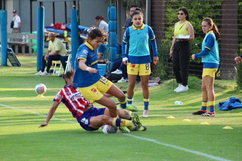 Las jugadoras del América no mostraban entusiasmo ni disposición para el juego, lo cual fue aprovechado por el equipo rival, que tuvo más llegadas al arco contrario, mientras que las Águilas apenas lograban avanzar hacia la mitad del campo.