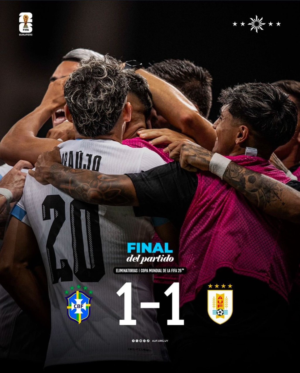 El empate entre Brasil y Uruguay los aleja cada vez más del actual campeón del mundo Argentina, que por el momento esperarán hasta Marzo del 2025 para poder recortar distancias y no quedarse fuera del Mundial 2026.