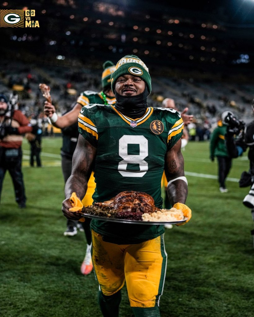 En esta ocasión, fue Jordan Love quien blandió el cuchillo ceremonial y cortó el primer trozo del pavo, ese trofeo único que simboliza más que una victoria. Alzó el trozo de carne, no como un gesto de arrogancia, sino como una forma de agradecer a cada uno por el papel desempeñado en la épica jornada. Era más que un brindis; era una ofrenda silenciosa al esfuerzo colectivo, al sudor derramado en cada yarda, al corazón que cada jugador dejó sobre el emparrillado.