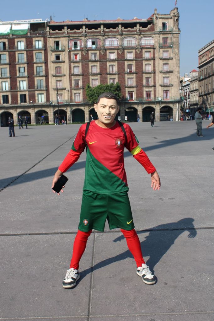 Y como si hubiera sido planeado, justo en ese momento llegó un adolescente caracterizado de su ídolo, la gente que se encontraba a la espera se empezó a dividir en dos, ambos grupos para tomarse foto con el uniformado de la selección de Portugal.