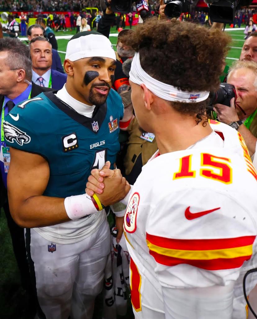 La escena de la noche definitivamente fue el saludo entre Patrick Mahomes y Jalen Hurts, el mejor quarterback de la liga felicitando al nuevo campeón y MVP del Super Bowl. Una foto que se engrandece por el juego que dejó cada uno. Hurts generó constantemente y Mahomes tuvo complicaciones pero cerró con todo.