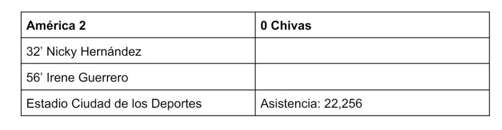 Las Águilas vencieron a Chivas con autoridad en un partido donde el desempeño del América llevó a las capitalinas a obtener el mejor resultado, esto a pesar de que Chivas llegó con mayor posesión y agresividad durante el inicio del encuentro. Sin embargo, terminó perdiendo ante las locales, que, tras superar los primeros minutos de presión, consiguieron la mayor parte del control durante el resto de los 90 minutos.