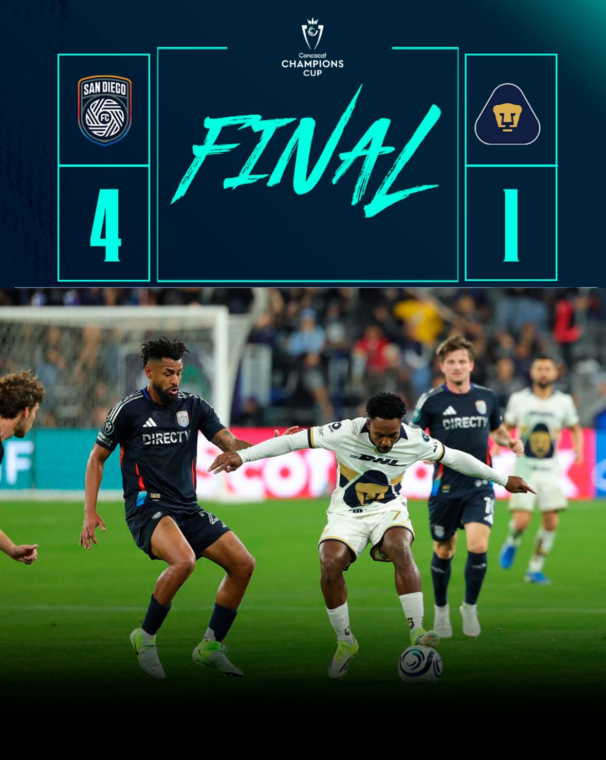 Ya en el segundo tiempo cayó el empate de los locales por parte de Manu Duah, quien aprovechó la desconcentración defensiva de los felinos en el tiro de esquina para meter el 1-1. Minutos después se vendría la remontada y, en menos de 10 minutos, los de San Diego anotarían tres goles para poner el marcador 4-1 y así culminar una remontada que terminó en goleada.