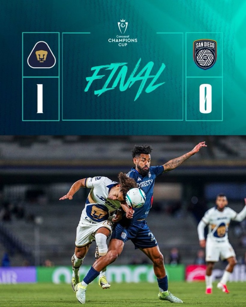 Los del pedregal vencieron al San Diego F.C. 1-0 en el estadio olímpico universitario, en lo que fue la vuelta de la primera ronda de la concachapions, sin embargo no fue suficiente para pasar a la siguiente ronda luego de haber perdido la ida 4-1 en San Diego.