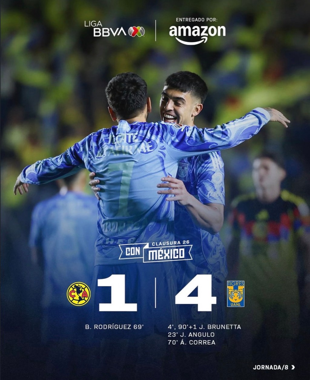 El América en cambio extrañó demasiado lo diferencial que es Zendejas, quien no pudo estar por lesión, pero también a Fidalgo, su estrella que partió a España para llegar al Real Betis. Sin ellos el medio campo se vio pesado, con Jonathan dos Santos corriendo detrás de la jugada. El gol de Brian Rodríguez fue una chispa que se apagó en menos de un minuto, lo que tardó Tigres en responder y liquidar el encuentro.