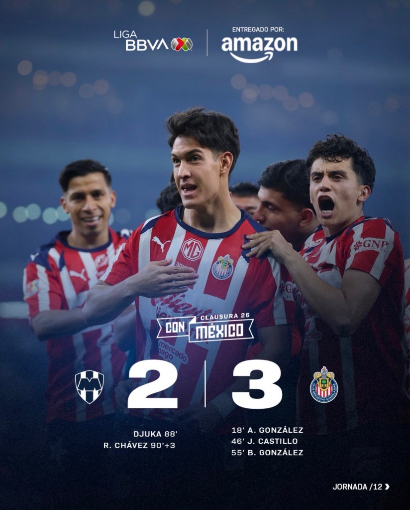 Guadalajara venció 3-2 a Rayados con aporte de Armando González que ya suma 10 anotaciones en la temporada y una atajada de penal de Raúl Rangel en el último minuto.