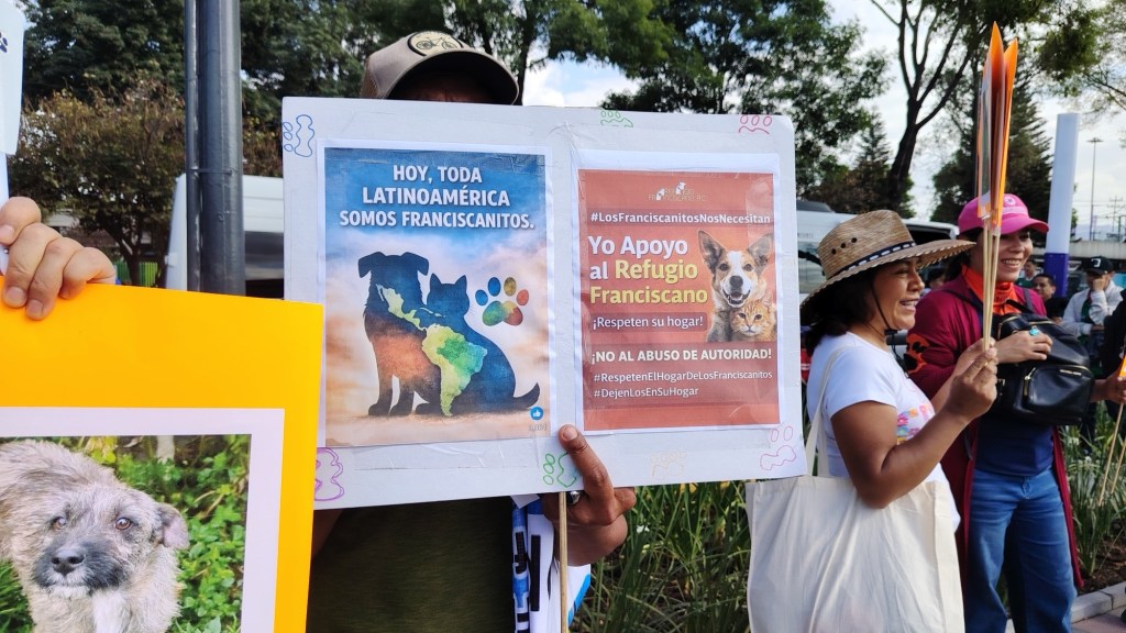 Voluntarios del refugio Franciscano, llevaron cartulinas y paneles informativos que buscaban dar voz a lo que consideraron una injusticia: el desalojo del albergue y traslado de los animales en malas condiciones.