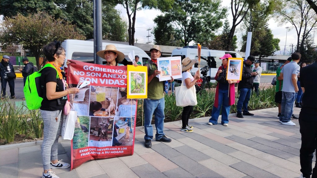 “Estamos aquí desde las 11 de la mañana, queremos que regresen a los animalitos que desalojaron injustamente, los llevaron a lugares sin comida, sin agua y sin atención”, explicó Antonio, uno de las manifestantes, mientras intentaba hacerse escuchar.