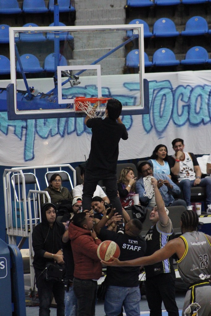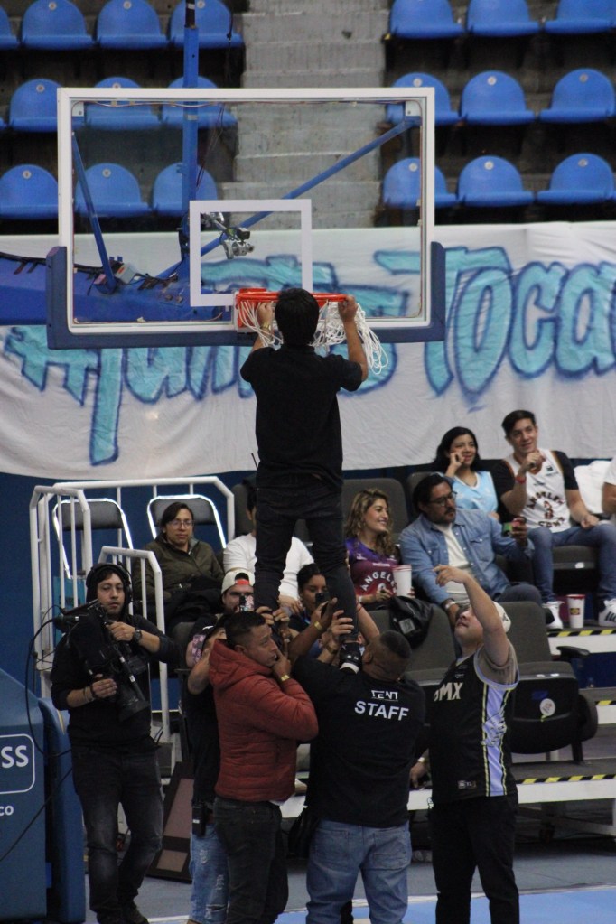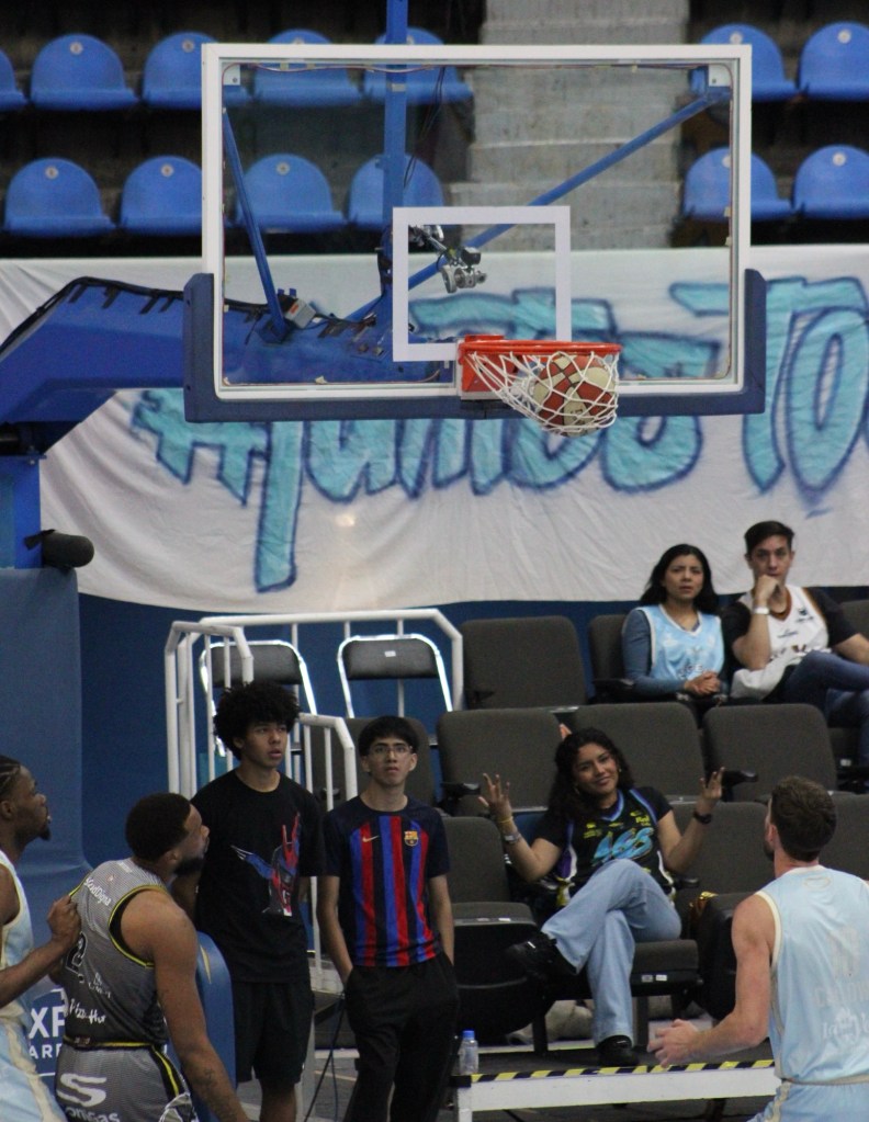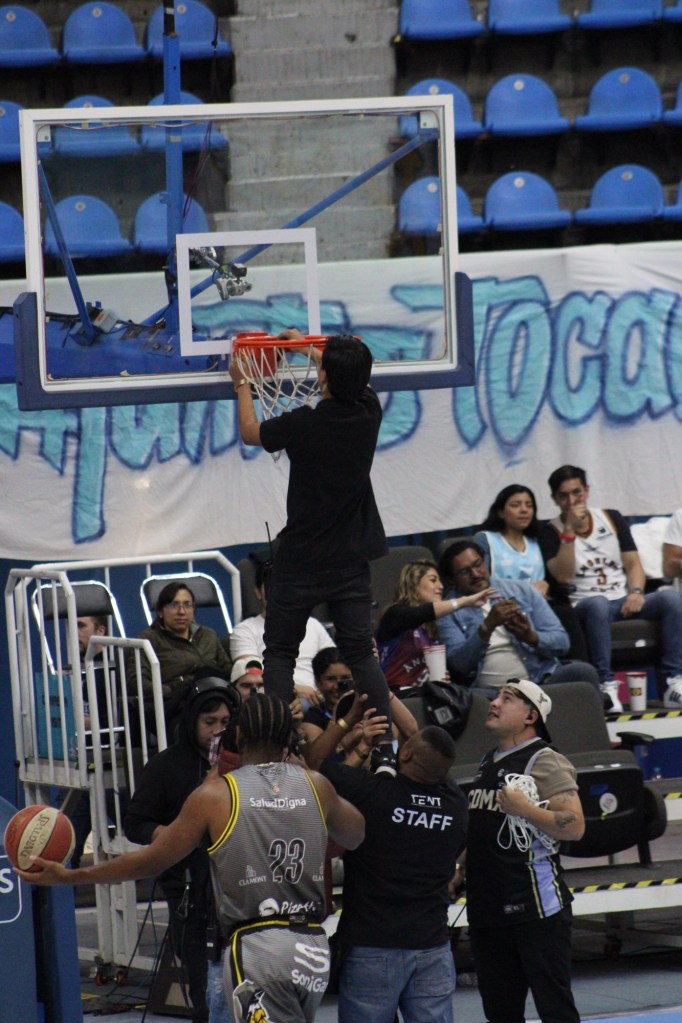 Uno de los momentos que más llamó la atención, ocurrió cuando se necesitó mantenimiento en la canasta. En lugar de traer una escalera larga y perder tiempo, vimos una escena muy a la mexicana: seis ayudantes del equipo de mantenimiento se unieron para cargar a un trabajador, levantándolo hasta lo más alto para que pudiera cambiar la red, generando risas entre los aficionados.