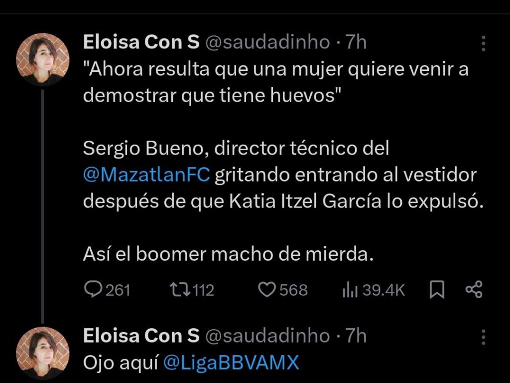 Katia Itzel García que esta a tan solo dos meses de participar como silbante en la Copa del Mundo 2026, recibió un comentario de mal gusto por parte de el entrenador de Mazatlán (Sergio Bueno), Katia al pitar el final de la primera parte y cortar una acción peligrosa del equipo cañonero, cosa que no fue del agrado del técnico.